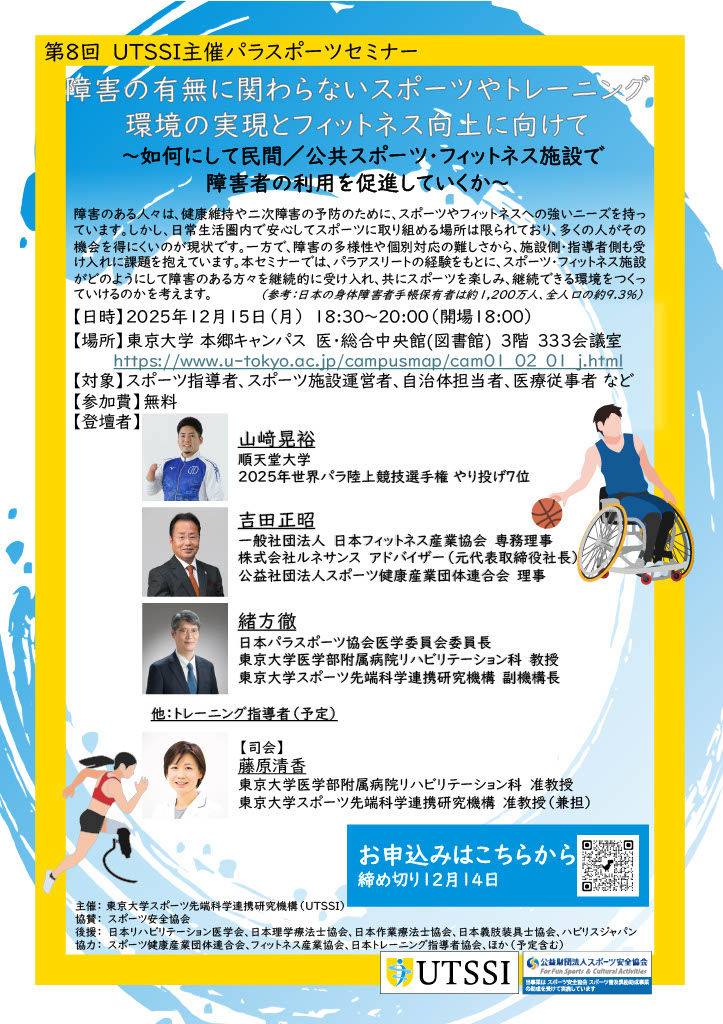 本フォーラムでは、アスリートが直面するケガからの復帰やストレス耐性の課題に対し、スポーツ医学・整形外科・睡眠科学・精神医学などの幅広い観点からアプローチし、実践につながる知見を共有します。UTSSIでは、第8回パラスポーツセミナーを下記のとおり開催いたします。